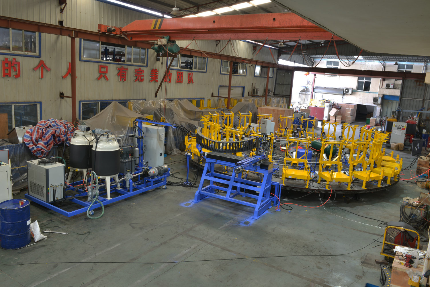配合圓盤、環(huán)形生產(chǎn)線或工作站實(shí)現(xiàn)自動(dòng)開合模,適用于所有模塑類型的聚氨酯產(chǎn)品生產(chǎn),高效低勞工,結(jié)構(gòu)合理、PLC控制實(shí)現(xiàn)穩(wěn)定運(yùn)行、維護(hù)簡便。